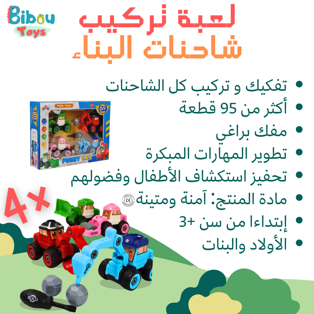 - composé de 4 véhicules de construction démontable avec accessoires et du tournevis fourni.